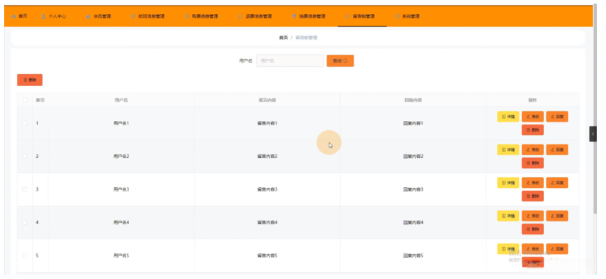 留言板管理功能在留言板管理页面提供全面的信息展示与互动服务。用户可在该页面浏览条目编号、注册用户名称以及发布的内容,并根据需求对相关留言进行回复、修改或删除操作(如图4-13所示)。