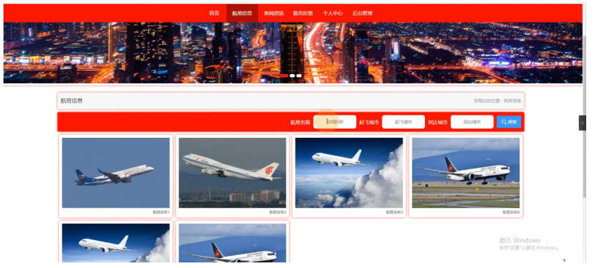 在系统首页提供航班信息查询功能,允许用户访问航班详情、新闻资讯以及客户反馈等内容。该系统包含航班信息查询、新闻资讯浏览、客户反馈留言、个人服务管理以及后台管理功能等核心模块。如图4-1所示