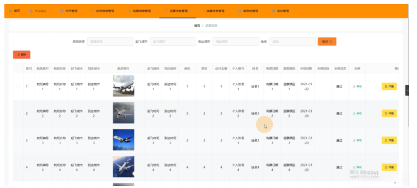 在该系统的退票信息管理界面中, 可以查询并获取包括索引字段、航班ID、航班名称、起飞城市、抵达城市以及 boarding imagery 等详细信息, 同时还可以查看 boarding imagery 以及离港时间、抵港时间等时间节点数据, 这些数据包括座位号、票价金额以及个人应付金额字段等详细项目. 如图4-11所示图示部分展示了各项数据.
