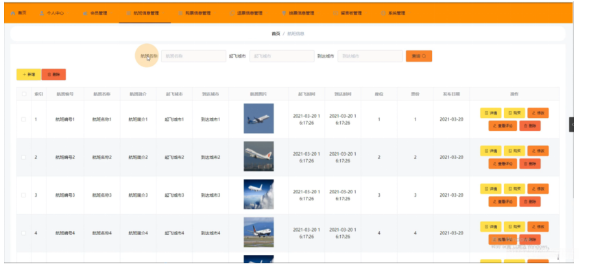在航班信息管理页面中提供了一个丰富的数据展示区域,在这里您可以浏览到航班编号列表以及各个相关细节信息包括但不仅限于航线名称飞行描述以及对应的起飞地点和抵达地点同时该平台还配备了航拍图作为直观的视觉辅助,并根据个人需求提供评论查询修改票务以及删除功能如图4-9所示