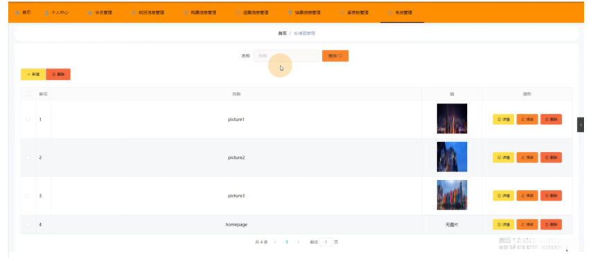 系统管理模块,在轮播图管理页面中可以实现;系统性地展示和管理索引、名称以及对应的数值信息;操作方面,则可以根据具体需求对新闻资讯进行相应的调整和优化(如图4-14所示)。