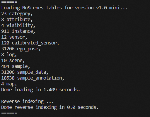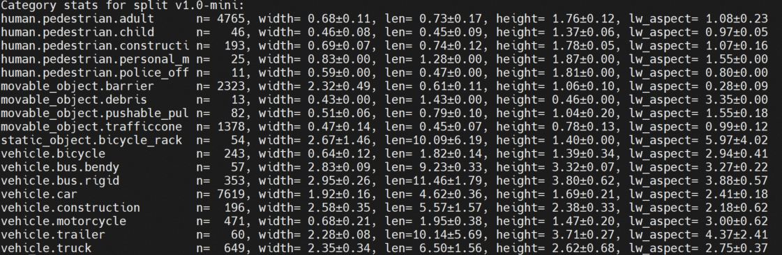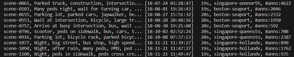 输出结果 : mini数据集中只包含10个场景,每个场景大约持续20s【有的19s】,即每个场景有20秒采集到的信息。