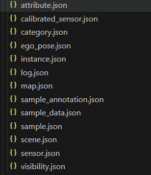 nuScenes数据集采用关系数据库来管理数据,数据库一共包含13张表,以json文件格式存储在./v1.0-version目录下。