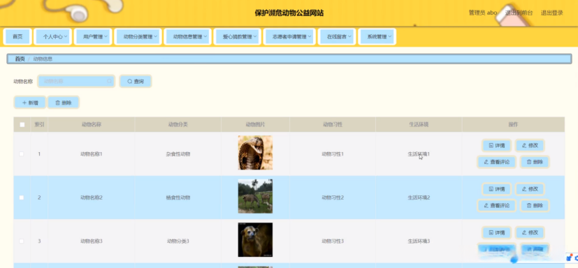 采用 animals information management system; 在 animals information management page 中浏览 index, animal name, classification, image, behavior, environment 等相关信息,并支持 detailed information retrieval, data update processing, interaction feedback viewing 和 record deletion operation. 如图 5-9 所示.