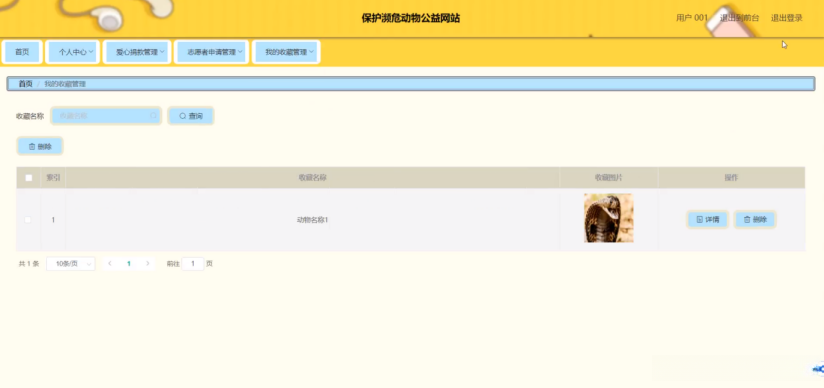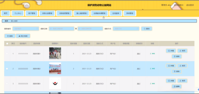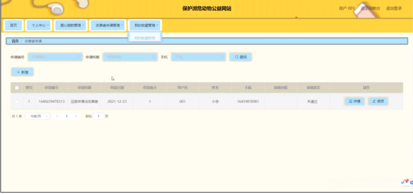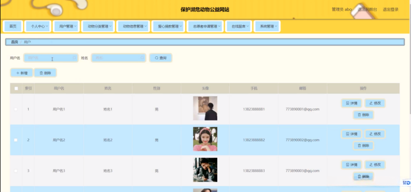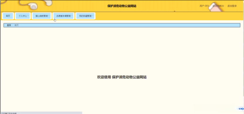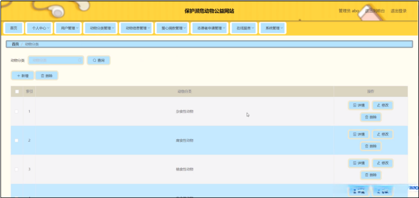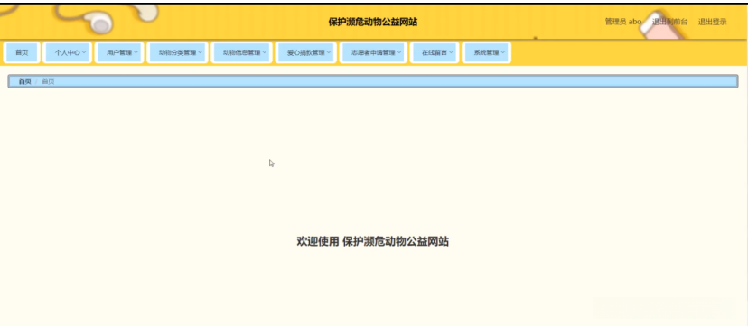 系统管理员登录后进入后台可以查看主页、个人中心、用户管理模块、动物分类模块、动物信息模块、爱心捐款模块、志愿者申请模块,在线留言区以及后台管理系统等各项功能,并可执行详细的操作步骤,请参考图5-6示意图。