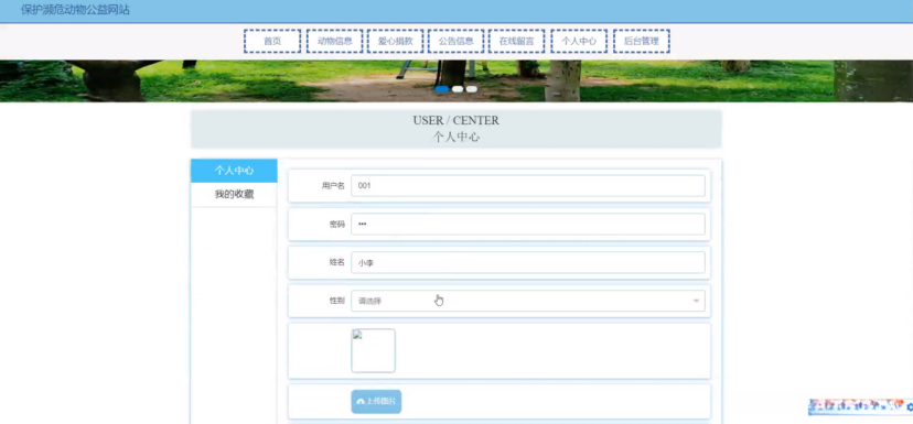 个人中心页面提供了一套完整的个人信息更新流程:用户需依次录入用户名、密码、姓名、性别等基本信息,并上传相关图片及手机号码和邮箱地址等联系方式;此外系统还支持用户根据个人需求对收藏内容进行相应的管理操作(如图5-4所示)。