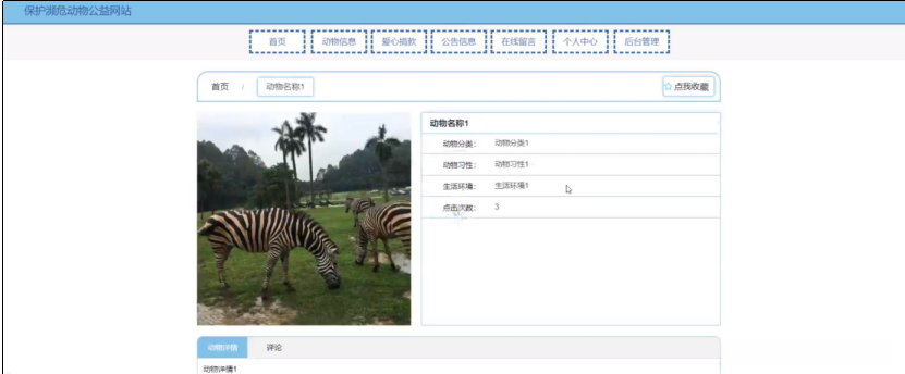 动物信息位于动物信息页面上,在此页面上可获取各类详细信息包括动物分类、习性、生活环境以及访问频率数据,并支持用户进行评论和收藏操作,请参考图5-3