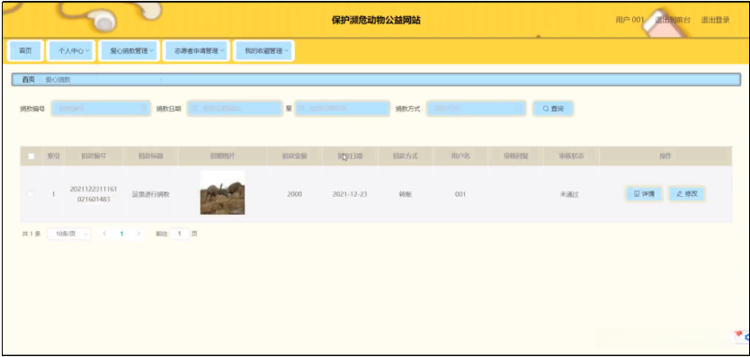 爱心捐赠管理功能;该页面提供索引信息、登记号、捐赠用途、配图展示以及具体的捐赠金额查询功能;您可随时查询捐赠日期、采用的支付方式以及登录人的详细信息;此外还可以了解处理结果反馈、审核状态信息以及相关的审核内容;如图5-10所示
