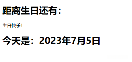 实现一个效果,在页面上显示当前日期年月日(格式: 2023年07月04日),和 距离你过生日还有多长时间,精确到天、时、分、秒(注:生日倒计时要实时变化)