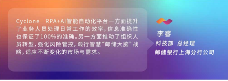 弘玑Cyclone RPA智能自动化平台通过紧密配合邮储大脑技术,在多个领域展开深度协作
