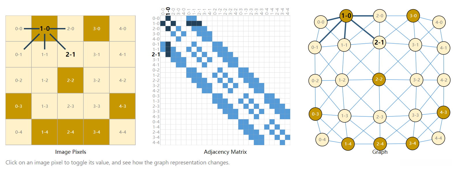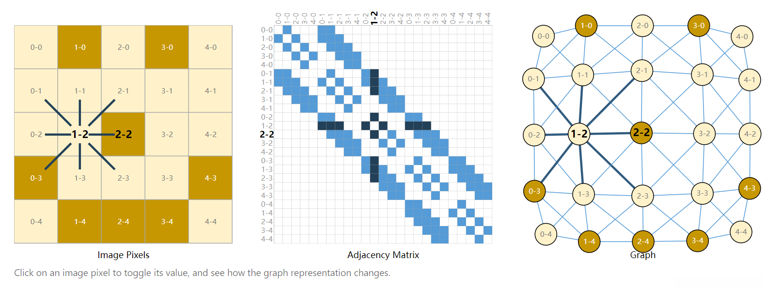 比如说一张图片可以表示为一个2442443的tensor,244*244个像素,3个rgb通道。就可以像下图这样表示,点表示的是像素,边表示的是像素间的邻接关系,建议大家去博客看一看,可以互动,更为直观。