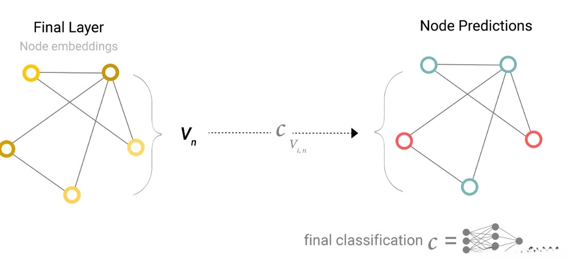 考虑最简单的情况,例如前面讲到的武术馆的那张社交图。根据那张图来预测学生最终会选择哪个老师,顶点已经用向量来表示,可以直接加一个输出为2的全连接层。