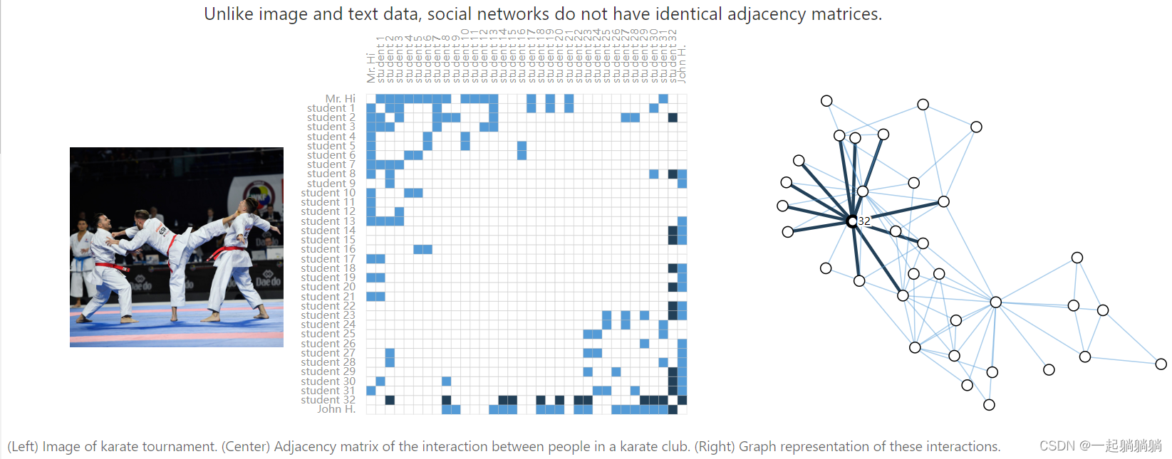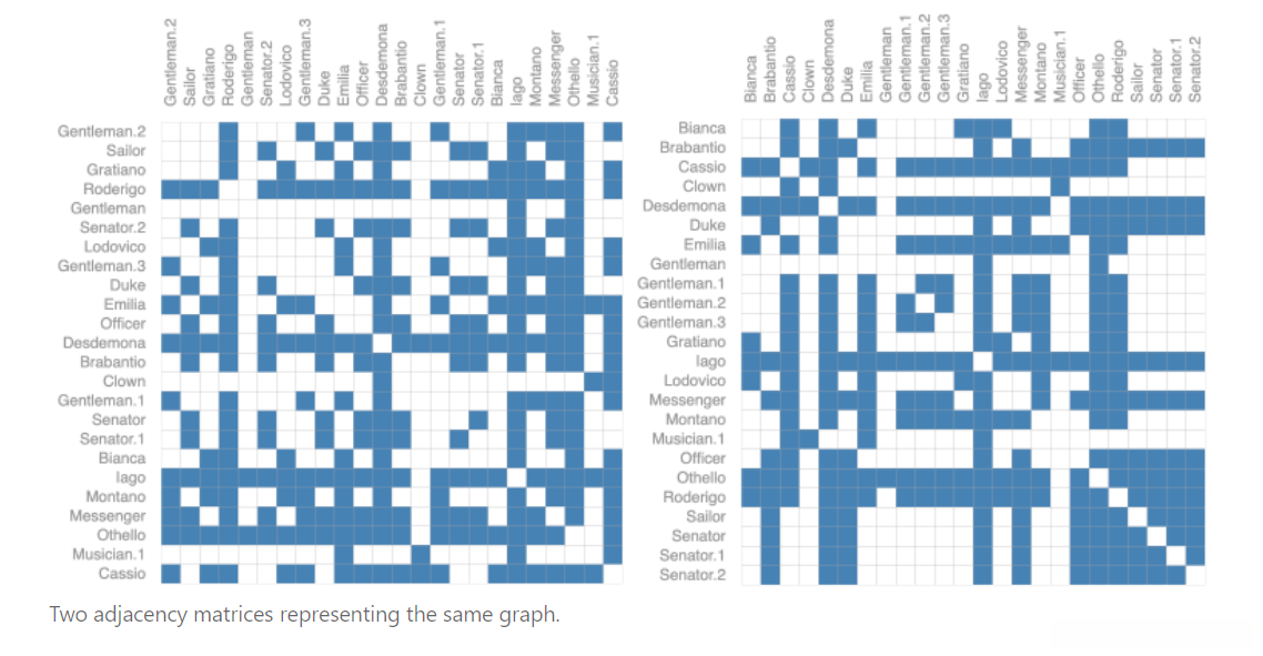 我们可以用邻接矩阵来表示,该矩阵会是一个方阵,但是有一些问题。这个矩阵可能会非常大而且很稀疏,在空间上效率低下,并且计算比较困难。另外将邻接矩阵的行或列的顺序进行交换不会改变其属性的。比如下面两张图都是前面“Othello"的人物关系图,看着不一样只是因为行和列的顺序不同,但是表示的信息是一样的。这就意味着如果你设计一个神经网络,无论你用下面两张图中的哪一张,都要保证得到的结果是一样的