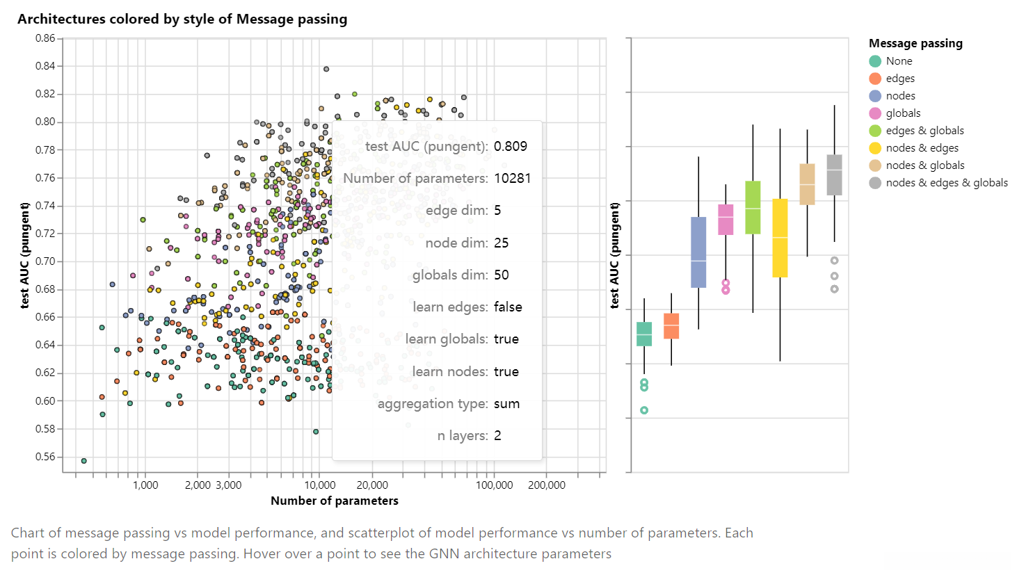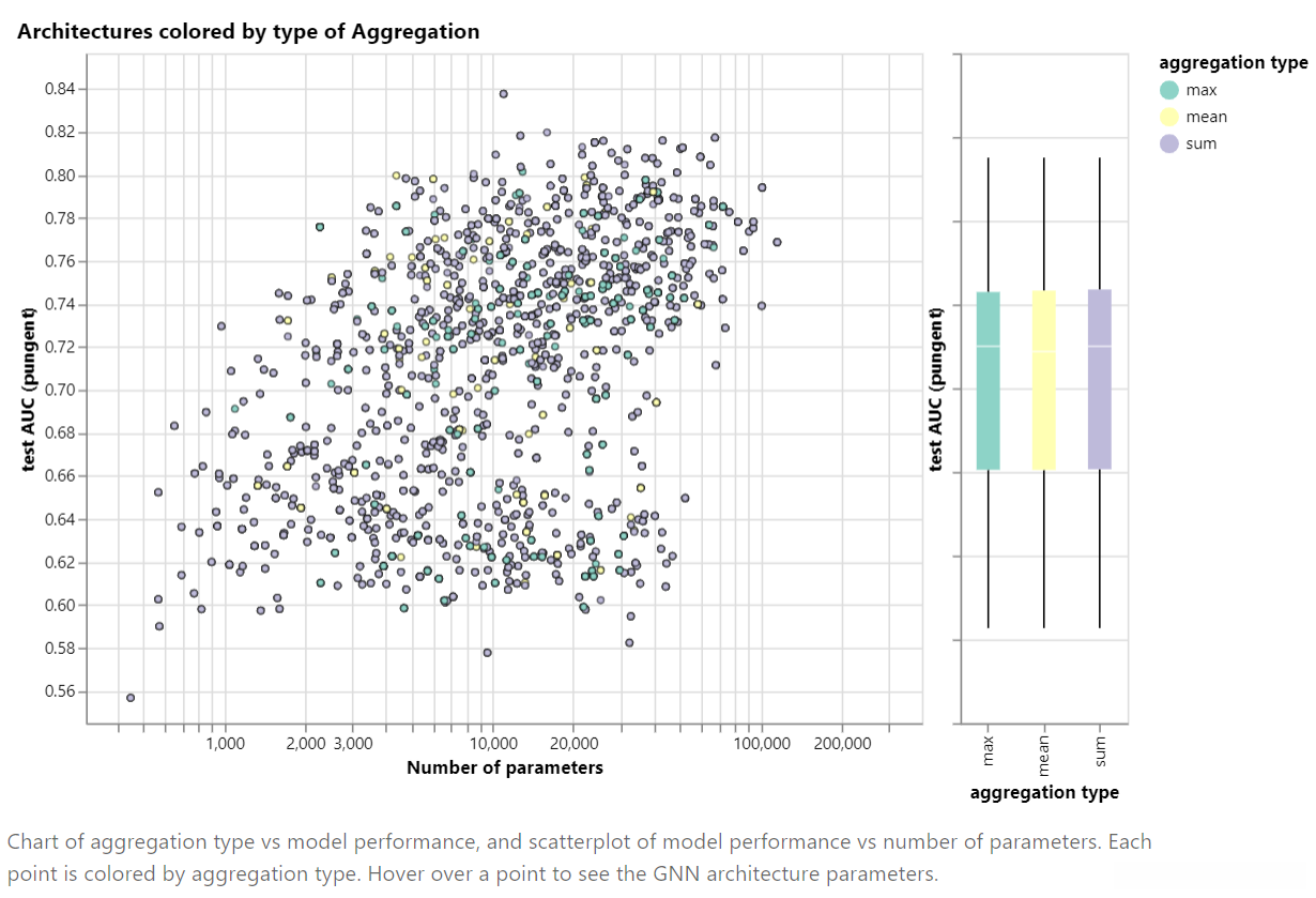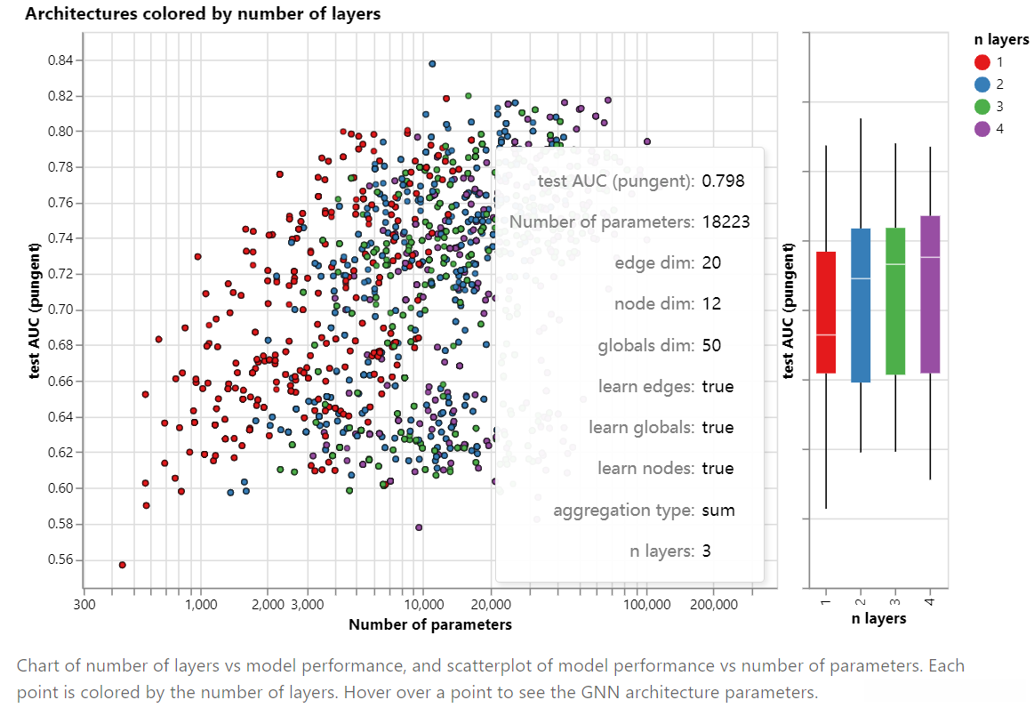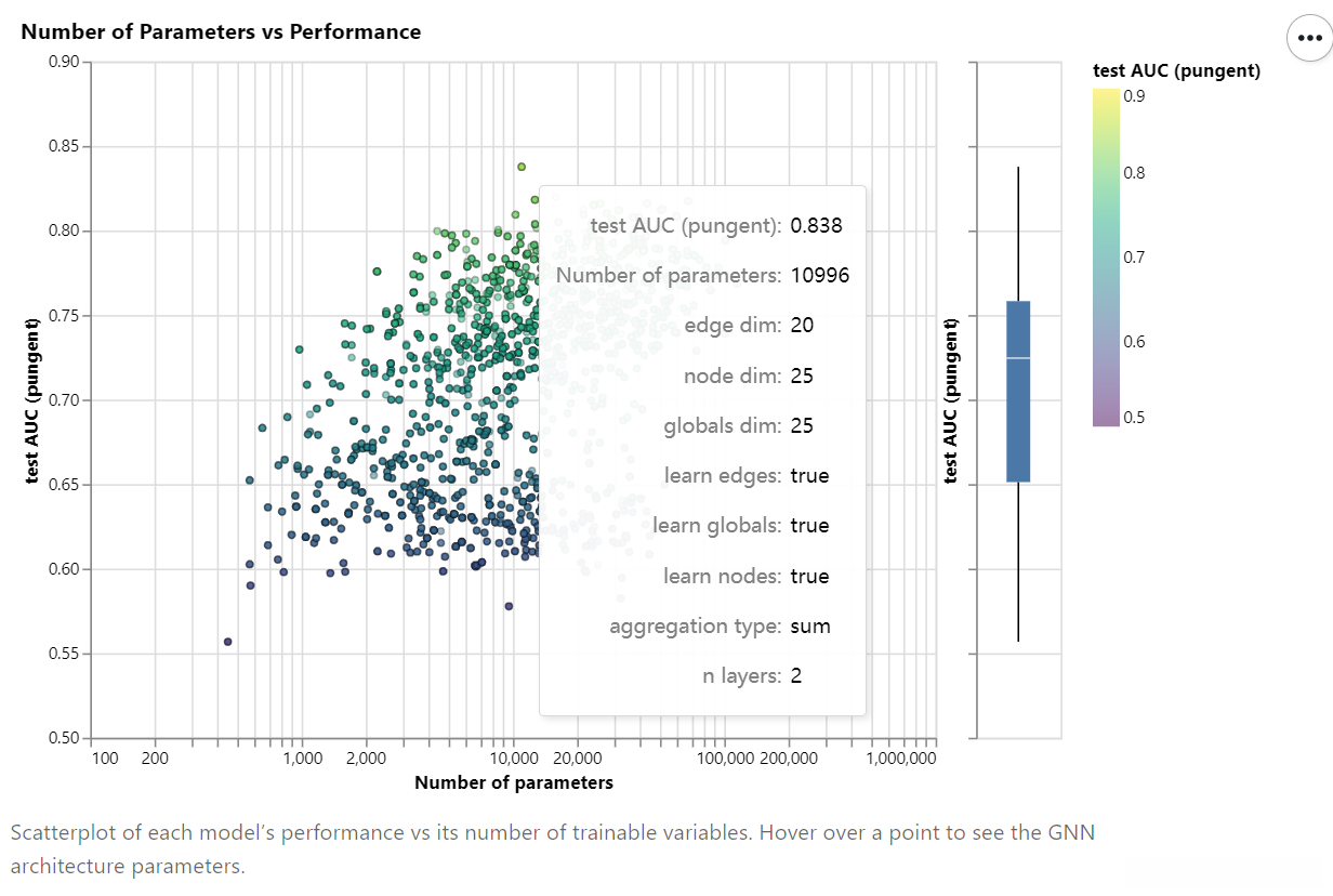 散点图中的每个点都表示一个模型:x 轴是可训练变量的数量,y 轴是性能。将鼠标悬停在某个点上可查看 GNN 架构参数。