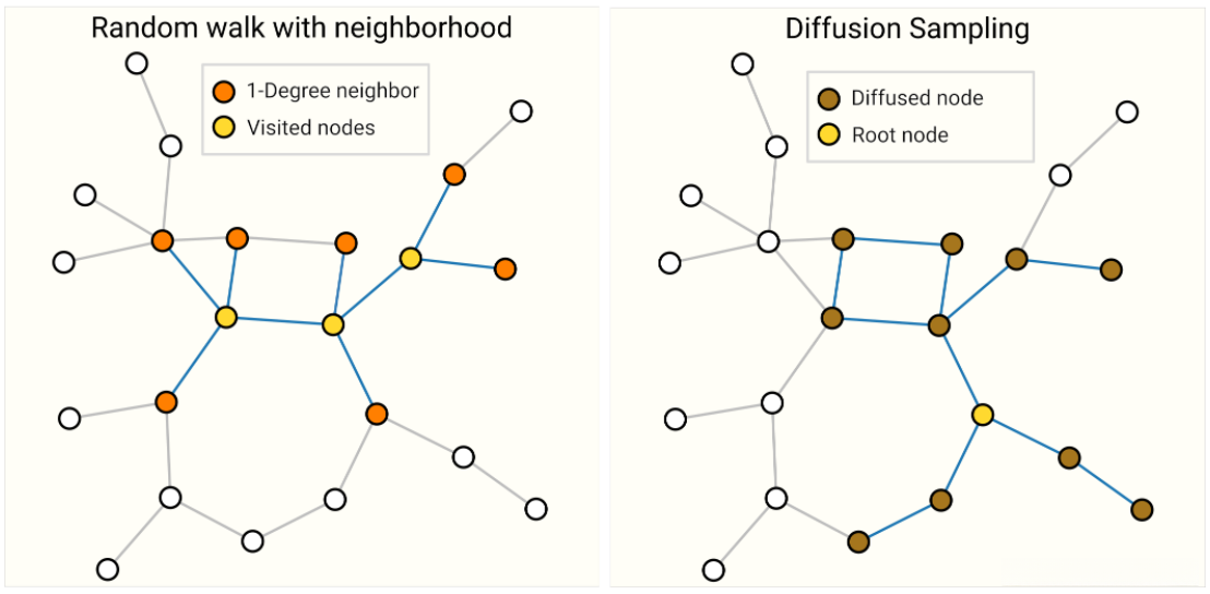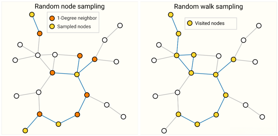 上图中,左边是说随机采样一些点,然后把这些点的1近邻找出来,构成子图,做计算的时候只在子图上做计算,我们可以控制这个子图的大小;右图是通过随机游走,随机找到一个点,从这个点开始随机游走,规定走多少步,然后得到一个子图。