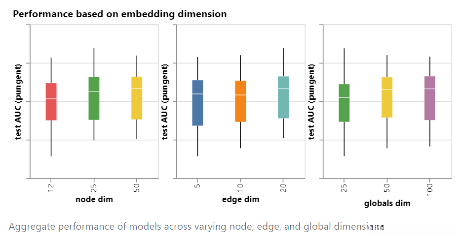箱形图显示出类似的趋势,虽然平均性能往往随着层数的增加而增加,但性能最佳的模型不是三层或四层,而是两层。此外,性能的下限随着四层的降低而降低。以前已经观察到这种效应,具有较高层数的GNN将在更高的距离广播信息,并且可能冒着从许多连续迭代中“稀释”其节点信息的风险。[27]