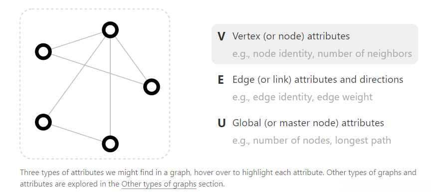 图是由一些点和一些线构成的,能表示一些实体之间的关系,图中的点就是实体,线就是实体间的关系。如下图,v就是顶点,e是边,u是整张图。attrinbutes是信息的意思,每个点、每条边、每个图都是有信息的。