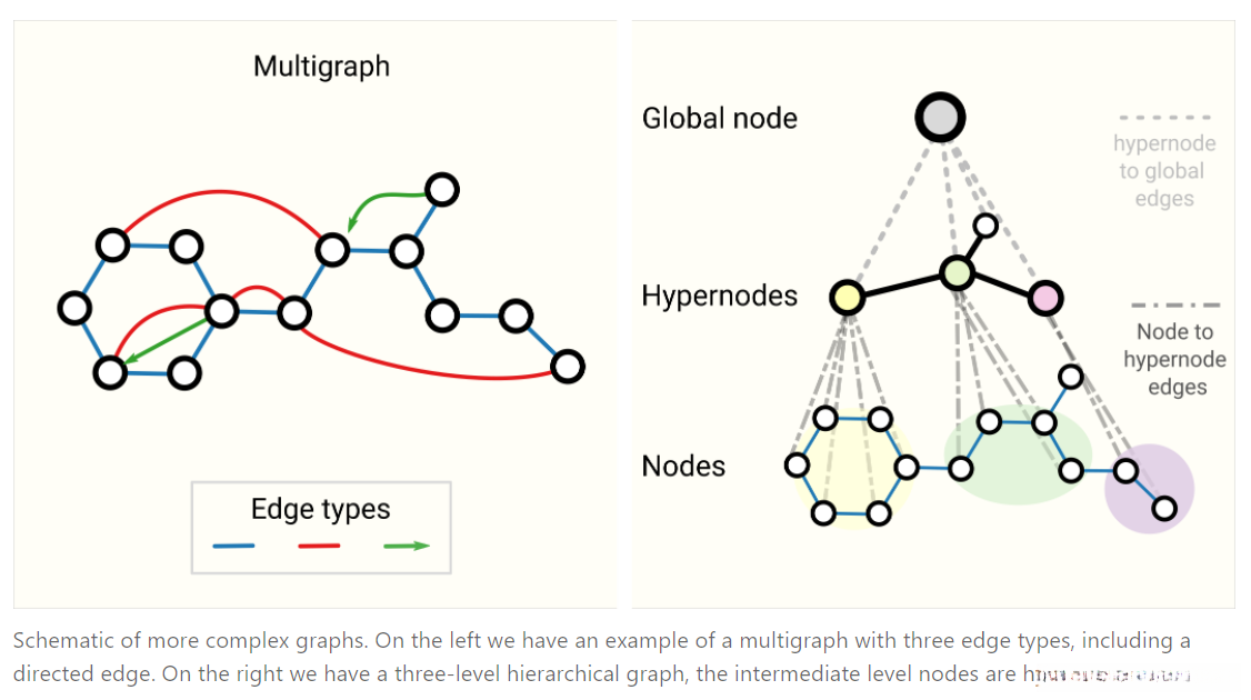 上面我们只考虑了单边图,现实中信息的内容是多样的,比如社会关系交错臃杂,不是单边图能够描绘清楚的,我们可以考虑很多种其他类型的图。比如,对于社交网络,我们可以根据关系类型(熟人,朋友,家人)指定边缘类型。可以通过为每个边缘类型提供不同类型的消息传递步骤来调整 GNN。我们还可以考虑嵌套图,例如节点表示图,也称为超节点图。嵌套图形对于表示分层信息非常有用。例如,我们可以考虑一个分子网络,其中一个节点代表一个分子,如果我们有将一个分子转换为另一个分子的方法(反应),则两个分子之间共享一个边缘。在这种情况下,我们可以通过有一个GNN在分子水平上学习表示,另一个在反应网络水平上学习表示,并在训练期间交替使用它们。[32][33][34][35]