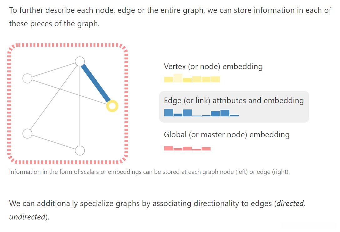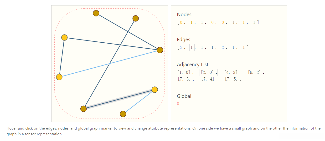 比如下方这个,顶点,边和全局信息都用标量来表示,也可以用向量,连接性用邻接链表来表示,邻接链表的数量和边的数量是一致的,第i项表示的是第i条边连接的两个顶点;这样表示就很高效,而且不会受到顺序的影响。博客里面是可以改变数值和边的数量的,建议自己去博客玩一下。