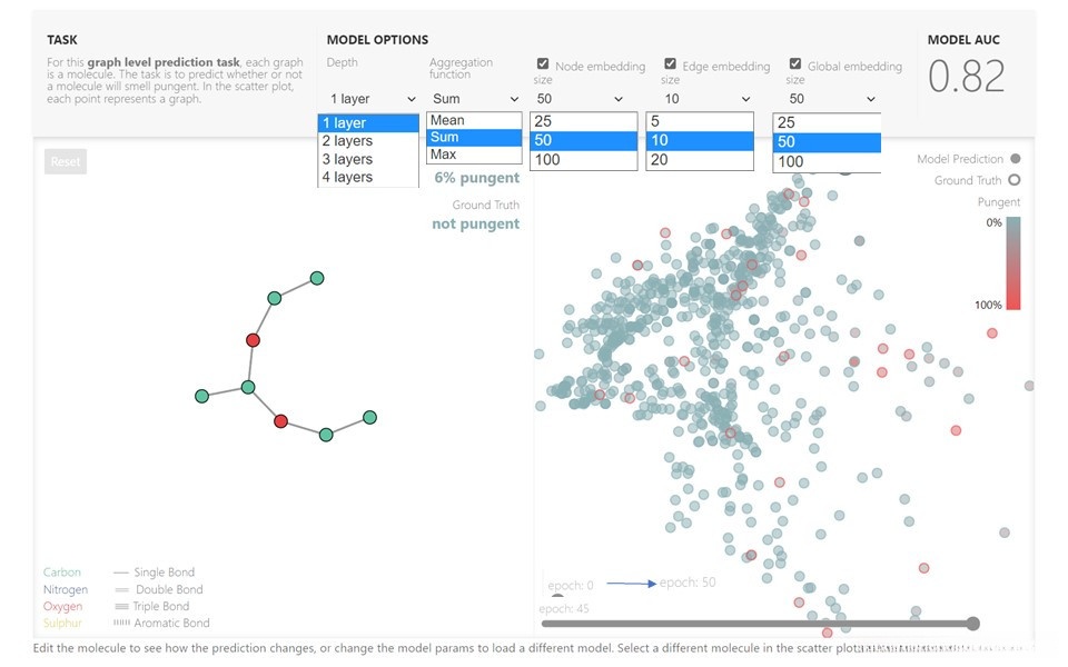原博客中,作者搭建了一个具有小分子图的图级预测任务模型,作者将一个GNN的预测程序嵌入到了java script里面,读者可以自行调节一些超参数来看预测结果,强烈建议自己去原博客看一看(链接:A Gentle Introduction to Graph Neural Networks)(如果加载不了请科学上网)。