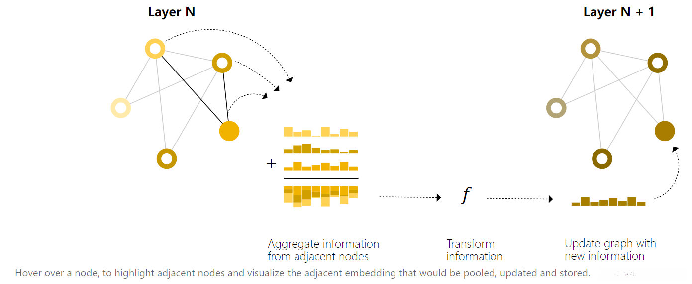 我们可以在GNN层中使用池化来感知到图形的连通性,做出更复杂的预测。可以通过passing messages来完成,通过消息传递,相邻节点或边缘传递信息并影响彼此的更新。