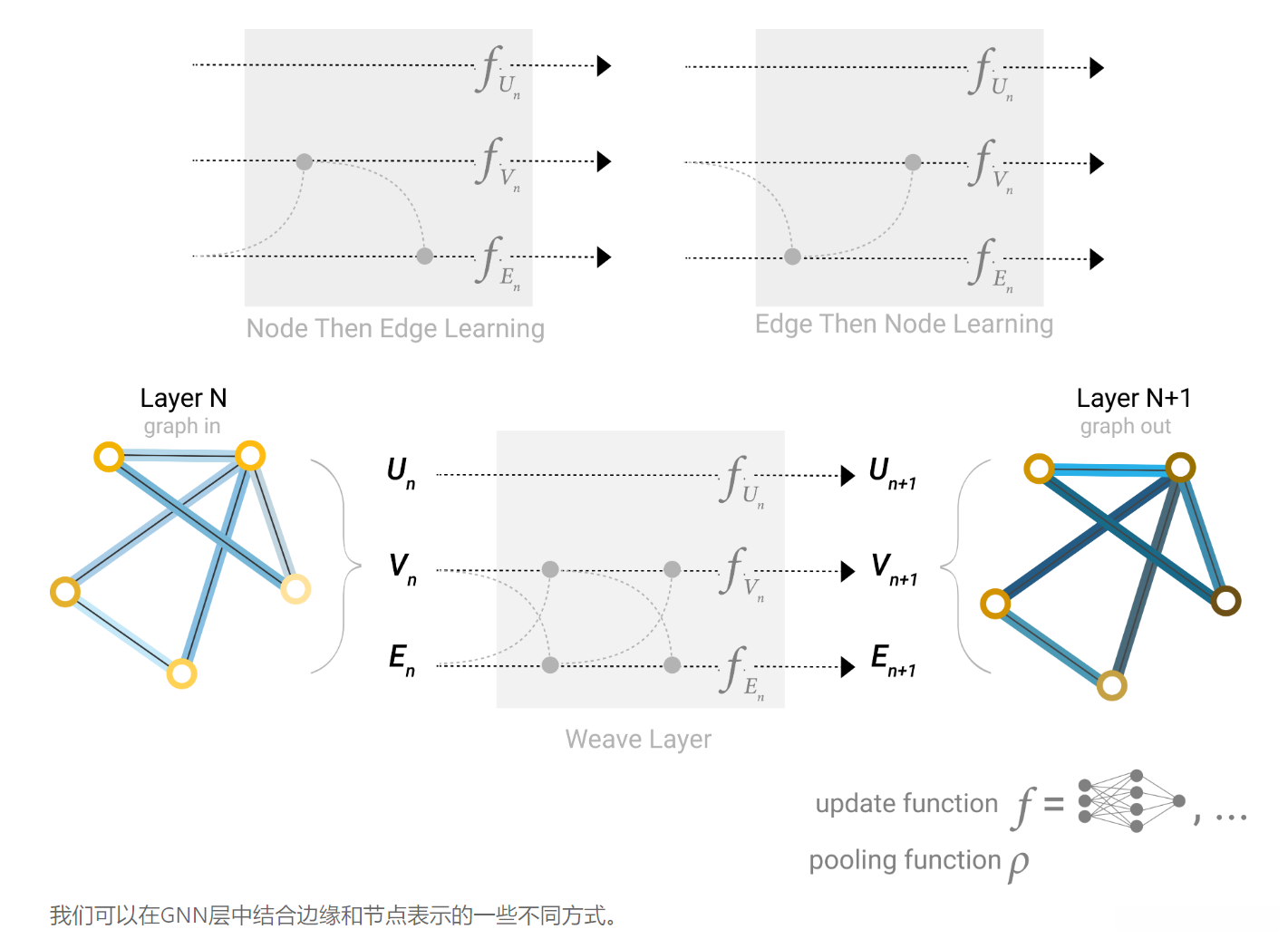 意思就是,在顶点预测中,我们可以用顶点信息、相邻顶点信息、连接边信息、全局信息中的全部或者选择其中几项,来更新顶点信息,做顶点预测;这些信息可以简单地加在一起,也可以通过其他方式汇聚在一起。