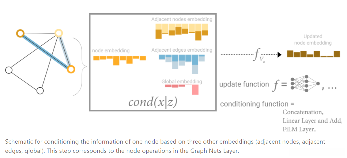 In this view all graph attributes have learned representations, so we can leverage them during pooling by conditioning the information of our attribute of interest with respect to the rest. For example, for one node we can consider information from neighboring nodes, connected edges and the global information. To condition the new node embedding on all these possible sources of information, we can simply concatenate them. Additionally we may also map them to the same space via a linear map and add them or apply a feature-wise modulation layer[22], which can be considered a type of featurize-wise attention mechanism.(原文)