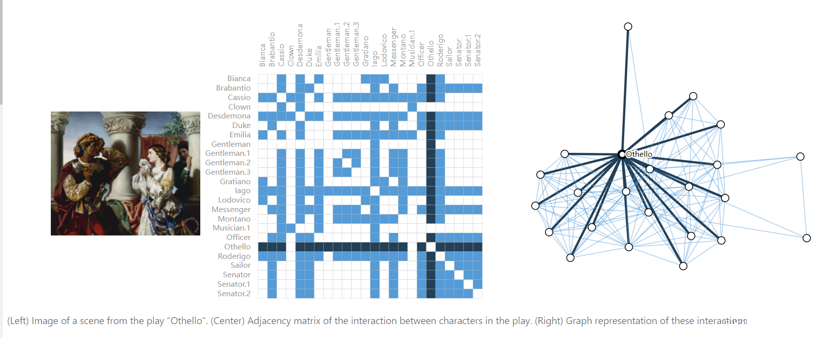比如将“Othello”中的人物关系表示成图,点代表人物,边代表这两个人物同时在一个场景中出现过