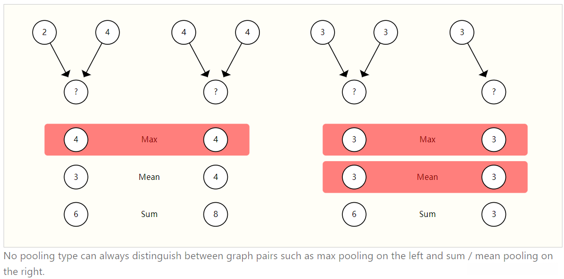 上面左图中,两个点对做汇聚,用三种不同汇聚操作得到不同的结果,其中max得到的结果是一样的,但是点对并不一样;右图中两个点对,max和mean得到的结果也是一样的,但是点对并不相同;sum也很容易找到无法区分点对的例子,比如点对分别为1、5和4、2,这个例子中sum得到的结果也是一样的。没有一种是更好的,需要具体问题分别对待,但是更多的是选择求和。