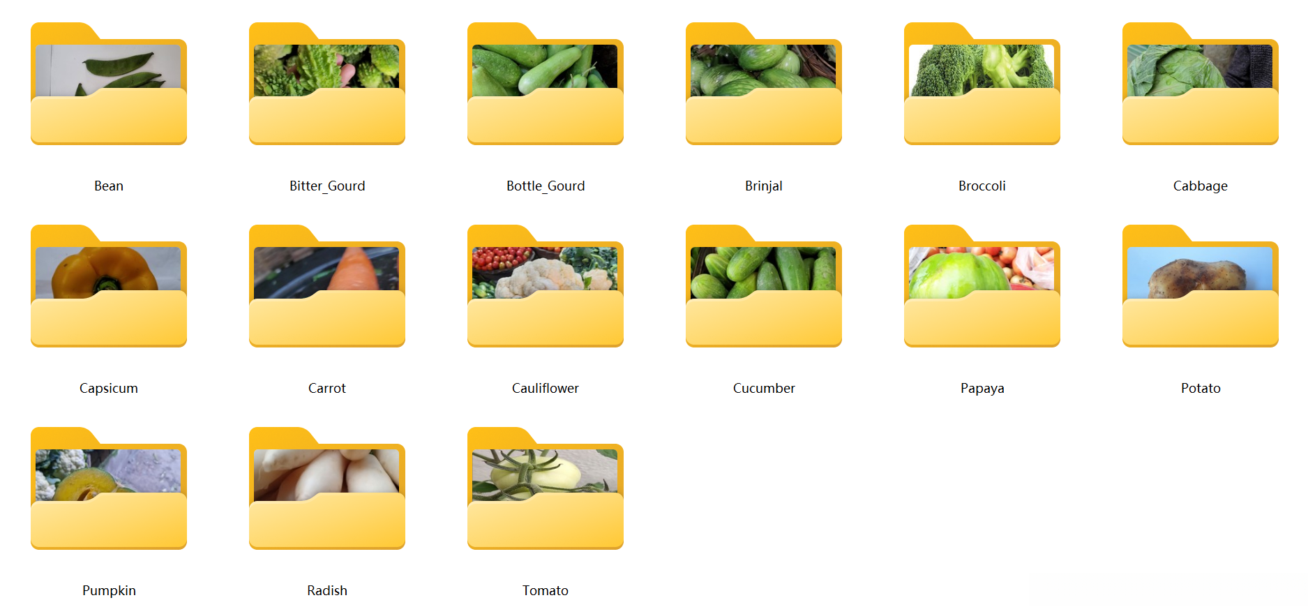 共十五种植物的幼苗图片集,分别为classes = ['Bean', 'Bitter_Gourd', 'Bottle_Gourd', 'Brinjal', 'Broccoli', 'Cabbage', 'Capsicum', 'Carrot', 'Cauliflower', 'Cucumber', 'Papaya', 'Potato', 'Pumpkin', 'Radish', 'Tomato' ]