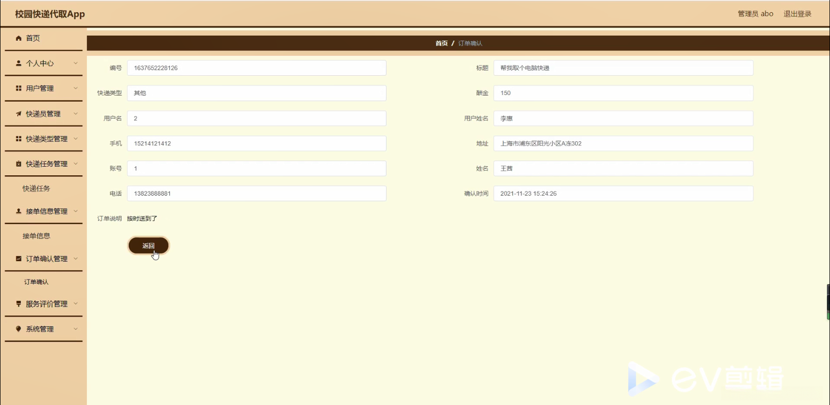 本研究主要致力于校园快递代取App的系统功能设计与实现。该系统涉及用户模块、快件员(FastCourier) module, 快件类型 module, 快件任务 module, 接单信息 module, 订单确认 module 和服务评价 module 等主要功能组件。具体而言:1)用户 module 负责用户的注册与登录操作,并提供个性化配置选项;2)FastCourier module 实现了账户创建与登录流程,并支持其日常工作中的派送需求;3)fastest type module 定义并管理各类标准fastest type 的属性参数;4)fastest task module 实现了从生成到分配再到全程跟踪的功能流程;5)接单信息 module 提供实时更新fastest worker 工作状态的数据接口;6)订单确认 interface 确保参与者能够即时获取包裹acknowledgment 信息;7)service evaluation interface 建立了反馈机制,在此基础上可动态优化服务表现
