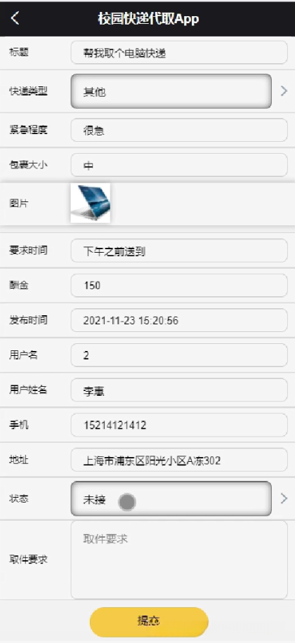 针对校园快递代取需求的应用程序研究与开发不仅能够显著提升学生的寄递便利性还能有效缓解其日常事务所导致的时间与精力压力与此同时还能进一步优化配送人员的工作流程从而使其工作效率和服务质量得到持续提升基于应用程序收集的学生反馈信息团队还能够不断改进和完善相关服务切实满足日益增长的学生群体对多样化需求的需求这一研究成果不仅对于推动移动互联网技术在教育领域的深化应用具有重要意义而且对于构建智慧型学习环境也发挥着关键作用