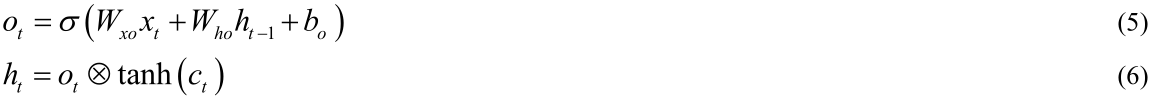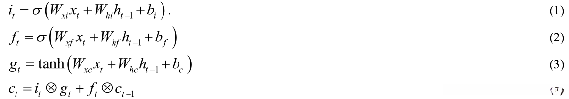 代表element-wise multiplication(逐元素乘法);x是时间t的输入向量;ht代表隐藏状态;Wxi Wxf Wxc Wxo分别是Xt不同门的权重矩阵;Whi Whf Whc Who是ht不同门的权重矩阵;bi bf bc bo是每个栅极的偏置偏移。it ft ct ot分别代表输入门,遗忘门,存储单元状态和输出门。