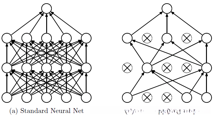 Dropout说的简单一点就是:我们在前向传播的时候,让某个神经元的激活值以一定的概率p停止工作,这样可以使模型泛化性更强,因为它不会太依赖某些局部的特征,如图1所示。