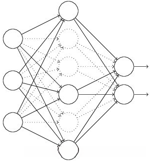 (1)首先随机(临时)删掉网络中一半的隐藏神经元,输入输出神经元保持不变(图3中虚线为部分临时被删除的神经元)