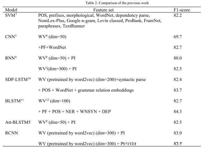 表2显示了将我们的RCNN模型与其他有关关系分类任务的最新方法进行比较。该实验由著名的深度学习工具TensorFlow实施,TensorFlow是使用数据流图进行数值计算的开源软件库。我们提出的RCNN模型的F1分数达到83.7%。它仅使用POS标签就优于大多数现有竞争方法。但是,当不使用任何语义特征时,该模型的性能最佳。