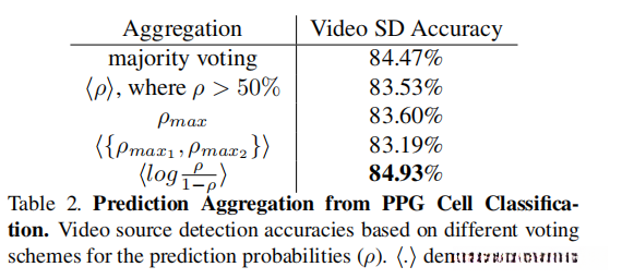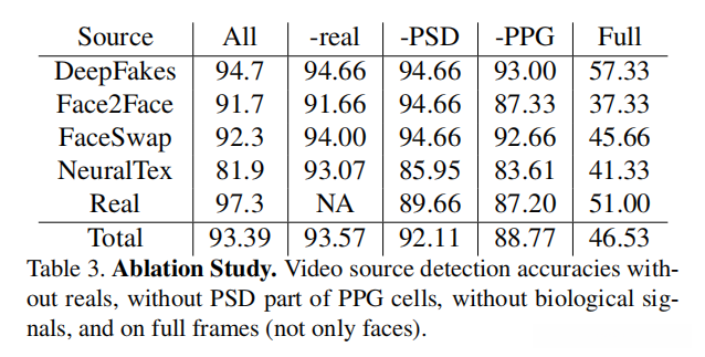 研究人员在多个不同场景下分别进行了训练与测试:1. 训练数据集中不包含真实视频样本;2. PPG单元中缺乏功率谱信息;3. 没有采集到生物信号数据;4. 采用了整个图像而非仅面部区域的ROI(Region of Interest),其中ω=64,并将FF(Frontal Face)数据集的分割参数设定保持恒定。实验结果如表3所示。