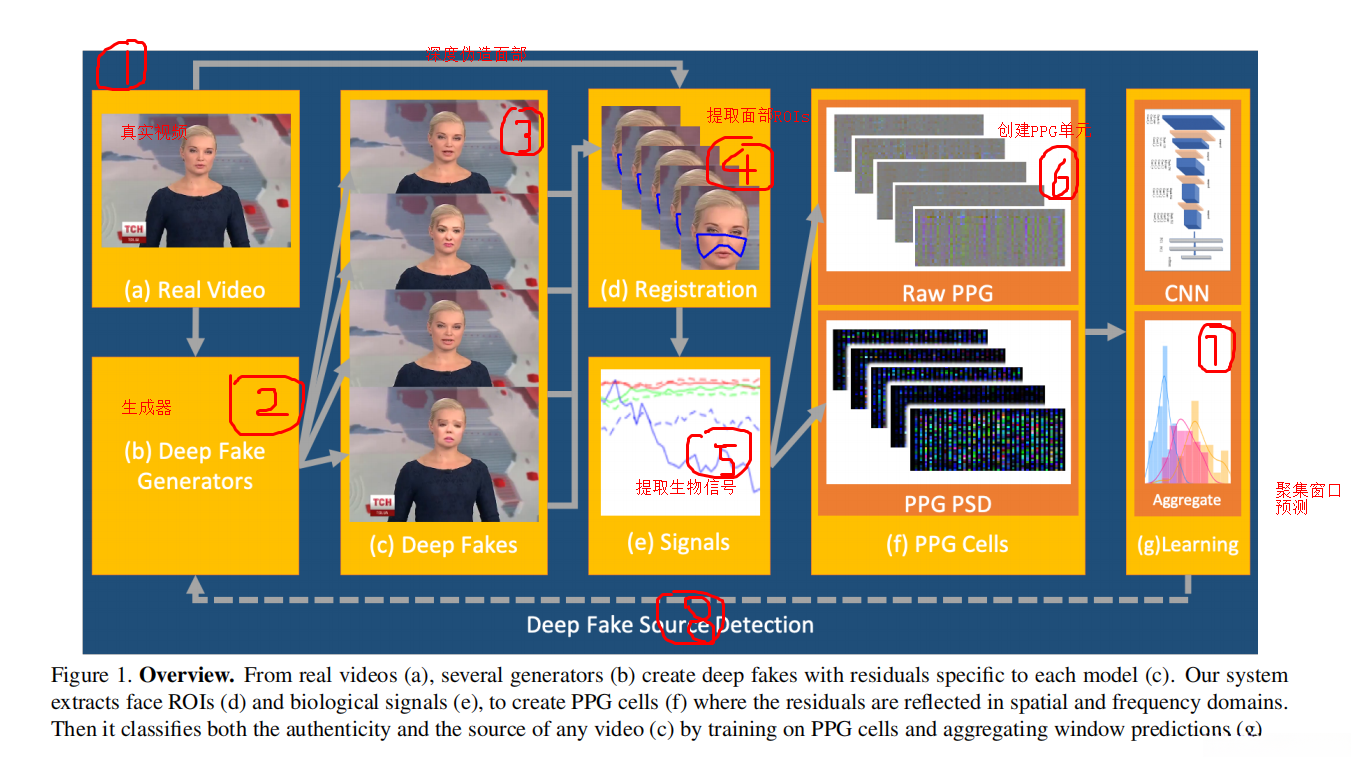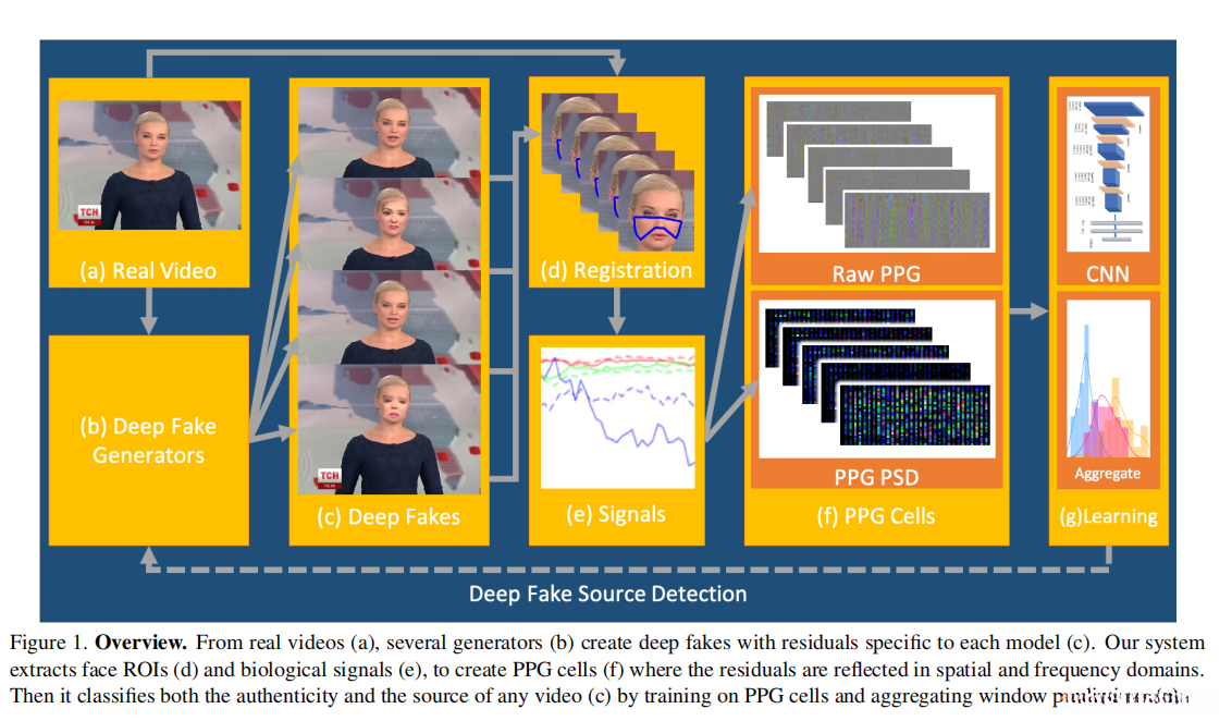 基于真实视频序列(a),通过多组生成网络(b)分别运用各自特异的残差特征(c),我们构建了深度伪造内容。该系统通过采集面部区域-of-interest(d)以及生物信号(e),用于构建PPG单元(f),其中其残差特征(g)同时体现在空间域和频域上。接着,在对PPG单元(h)进行训练并实施滑动窗口预测方法(i)的基础上,我们能够判断其真实性和来源(k)。