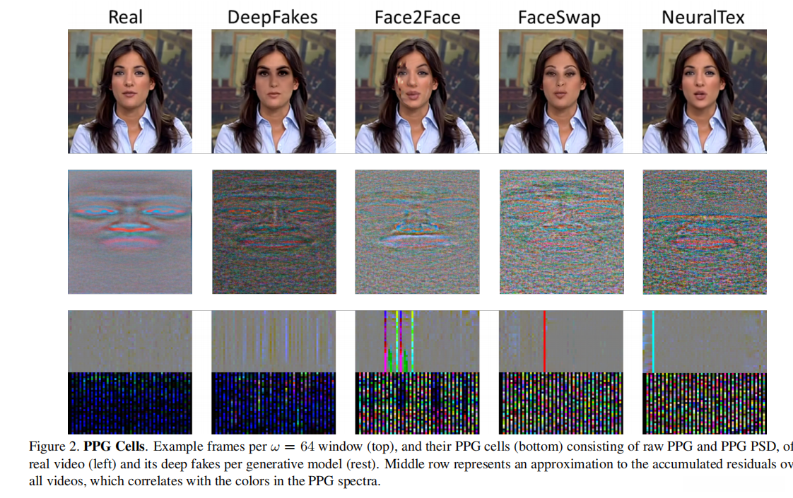 创新: 基于纯深度学习方法的研究者尝试利用卷积神经网络(CNN)对伪造视频进行分类任务。作者认为,在生成模型中提取的残差特征可能包含更丰富的信息资源,并提出通过与生物信号分离的方法来揭示视频伪造的具体细节。实验结果表明,在真实视频与虚假视频之间提取的人体光谱光电子图(PPG)单元特征具有显著差异性。为了验证这一发现的有效性,研究团队从真实视频和虚假视频中分别提取PPG特征,并将其输入当前最优分类网络中进行特征匹配分析。