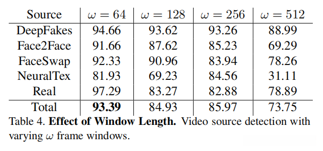 基于所述配置,以不同尺寸的窗口(ω = {64, 128, 256, 512} 帧)对本文所提出的解决方案进行评估。实验结果请参考表 4。