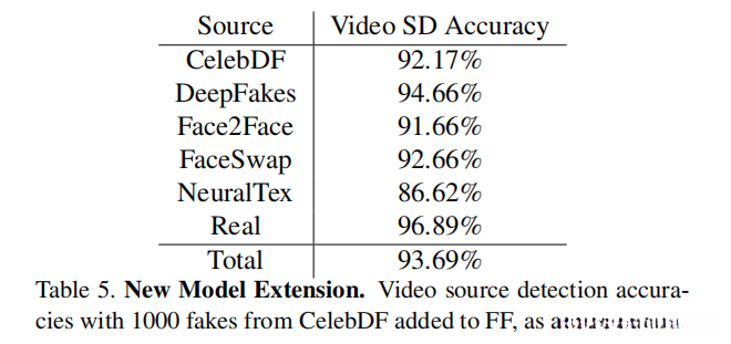 为了验证所提出的方法适用于新模型架构的可能性, 研究人员采用了FF设置与CelebDF单一生成器数据集相结合的方式, 并对整个分析流程进行了反复进行分析流程以获取可靠结果. 研究结果表明, 所提方法在整体测试集中实现了93.69%的检测精度, 同时其在CelebDF单一生成器测试集中也获得了92.17%的检测精度, 这一成果充分证明了所提出的方法具备良好的泛化性能(参见表5):