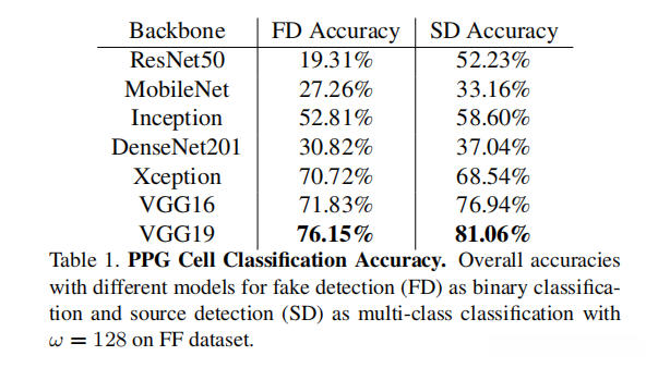 表 1 呈现了测试集上的PPG单元分类结果对比分析,在区分4种生成模型以及检测真实视频方面(图 1f),VGG19 显著优于其他网络架构。尽管在训练集上表现出色的DenseNet和MobileNet模型尽管在训练集上表现出色(图 1e),但在测试集上的推广能力仍有待提升。这表明这些复杂网络模型在避免过拟合方面的不足导致其在实际应用中的局限性更加明显。