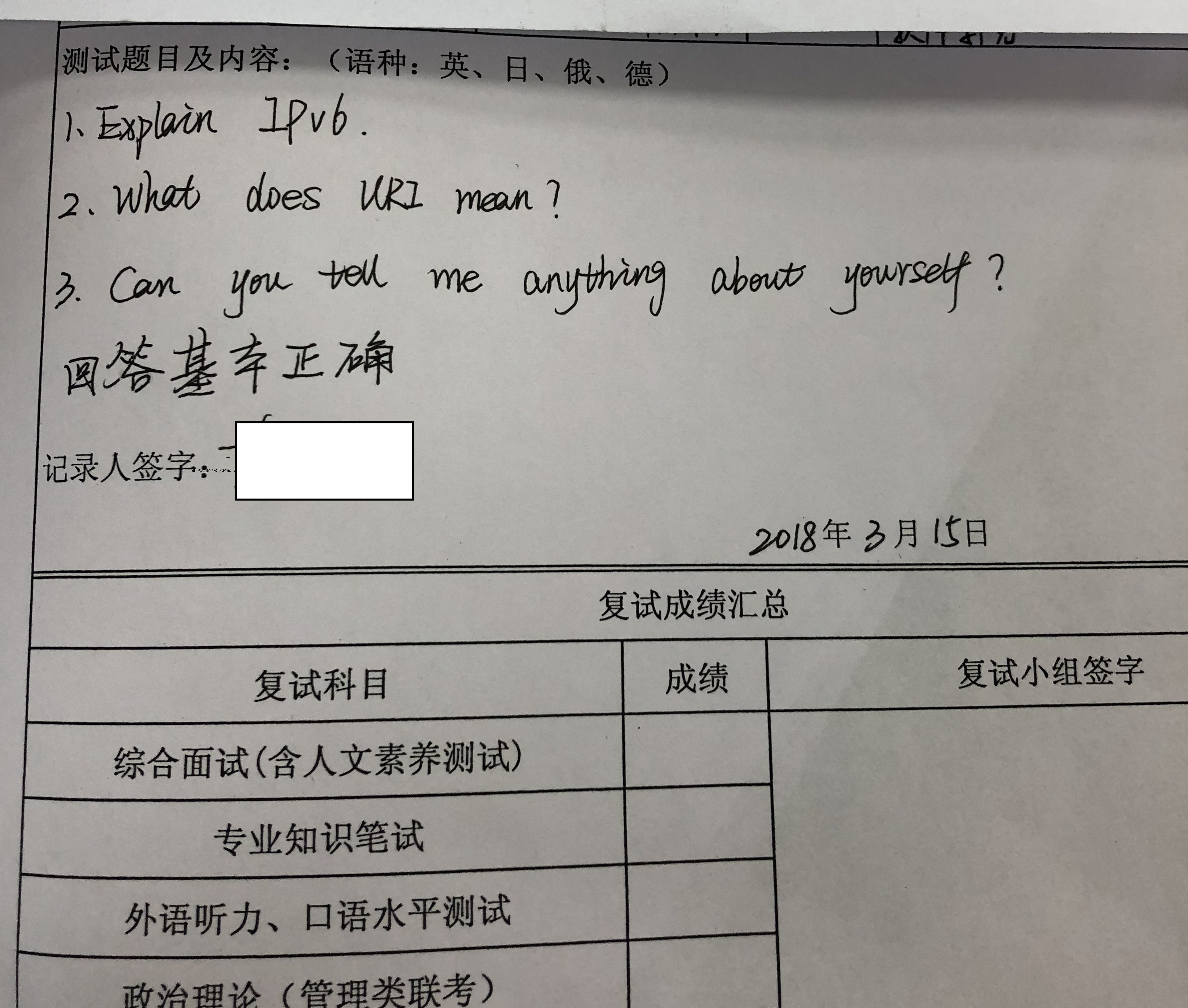 我是较之其他人较晚的一名应考者,在考时已是下午三点整左右的时候开始应考,每位考生的时间都非常紧迫。基本上每个人都会被提问到自我介绍环节(但这并非不准备的借口,请注意如果连三个与计算机相关的题目都无法正确解答,则会被问及类似'What's your hobbies'之类的问题),并被迫抽一张A4纸作答(内容必然是计算机相关),我的那张写着internet things#¥%……,老师要求从头读题并详细阐述思路过程)。然而,在读题过程中我却陷入了单一化思考模式:只注重句子结构的正确发音和流程性描述而忽视了内容的理解与把握。当被问及'internet things'具体含义时(老师似乎对此类问题较为宽容),我支支吾吾地说不出完整答案(老师随后解释道只要把缩写展开就能完美作答)。令人欣慰的是老师的提问对象是一位专业人士(无论是计算机领域还是英语交流方面都不容糊弄)。随后一个问题接着一个问题地被抛出:What is the meaning of IPV6? 当我对这一问题感到无能为力时(实际上IPV6只是个协议,在网络中可广泛应用,并且是互联网的标准组成成分之一),老师表示只要我能正确展开相关缩略语就能完美解答这些问题。最后一个问题更是让我感到有些困惑:What can this thing be used for? 在短暂的思考后我回答说它可以在WIFI环境下应用,并考虑是否还有其他可能性(结果发现仅限于局域网应用)。整个过程下来我觉得口语化的表达方式更适合缓解紧张情绪,并且自信程度远胜于结结巴巴地背诵答案