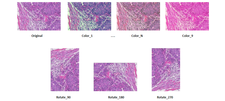 图1和图2展示了污渍中存在的各种颜色。为了使我们的模型可跨域使用,我们为训练集中的每个原始图像实施了九种颜色增强。这些增色改变了图像的颜色和强度。此外,我们对每个变换后的图像进行了3次旋转,以说明相机定位和组织样本方向的差异。这些预处理步骤将我们的训练集的大小从7,909张图像增加到285,000张图像。