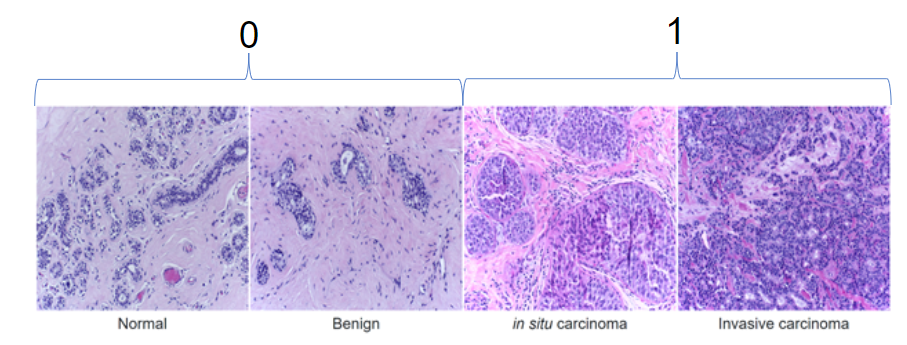 BACH数据集提供了400张图像,分为四类:正常,良性,原位和有创。良性肿瘤是异常的细胞团,对患者构成最小的风险。通常在被识别时,它就被单独放置[J]。一个原位肿瘤是未跨过身体系统扩散细胞的激进组。通常,它被认为是恶性前癌症,随着时间的流逝将变得恶性[J]。浸润性癌症是最严重的癌症类型,因为它已转移至超出其在体内原始位置的位置。对于此分析,我们将正常和良性标签视为健康组织,并将原位和浸润性视为癌性组织。
