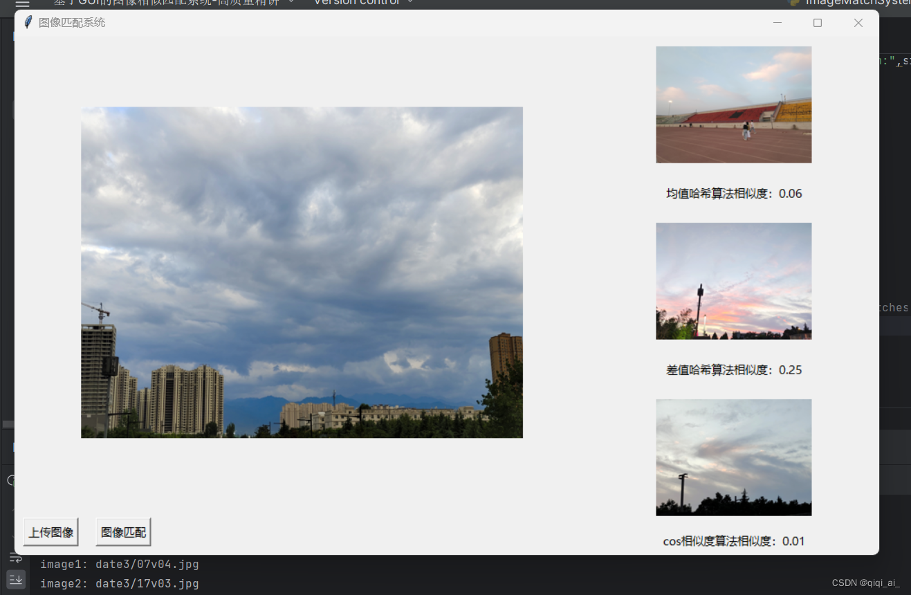 该系统基于GUI设计,使用Python实现图像相似匹配功能。通过均值哈希、差值哈希和cos相似度算法计算图像相似度,并通过UI显示匹配结果。系统支持上传多张图像,自动计算并展示前三个最相似的图像,适合图像检索和匹配应用。