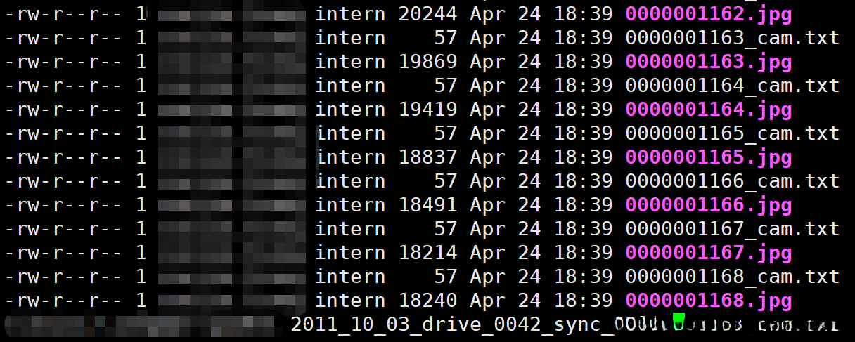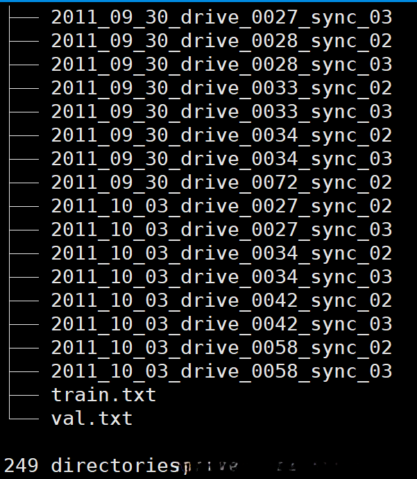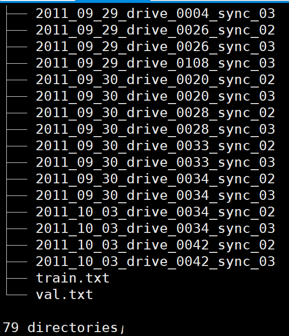 其中train.txt和val.txt分别存储了训练集和验证集图片的序号(范围:00-08)及其文件名信息。同样地,在每个文件夹中(对应于序列号为'xx'的情况),都有一个长度为9的一维向量被记录下来——这是相机内参参数的数据表示。每张图片都是从原始数据集中提取连续5帧图像拼接而成,并输入给网络模型进行处理。以'xx'序列为例,在原始数据集中该序列共有'xxxx'-xxxx帧图像数据(具体起始与结束帧数可能因场景而异)。因此得到的结果数量为(最大值 - 最小值 + 1)= xx张图像。(但是实际处理后得到的是'_cam.txt'中的数据?具体情况有待进一步确认,请参考代码文档)