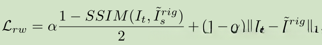 基于刚性变换的部分形变损失由视觉相似度表征, 即 目标帧的原图I(t)和通过刚性流与源帧 warp 得到的合成视图 ~ **I(rig;s)_ 之间的视觉相似度误差.