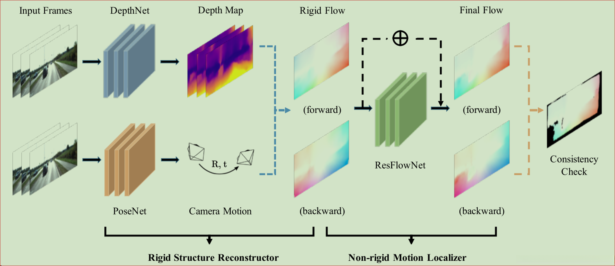 该文所提出的无监督学习框架GeoNet基于视频数据联合学习单目深度估计、光流场预测以及相机运动估计。其理论支撑来自于** 3D场景几何的本质特性和内在规律** 。具体而言,这意味着** 3D场景都是由静态背景和动态目标共同构成的** 。在许多自然场景中,通常是由** 刚性静态表面** 组成的(如道路、房屋、树木等),这些表面在连续帧之间的2D投影图像完全由深度结构以及相机运动所决定。与此同时,在这些静态背景下还包含着动态的对象存在(如行人、车辆等),它们的动力学行为是由相机运动以及自身的运动共同决定的。通过光流场的变化来模拟由于相机运动引起的图像变化是一种有效的实现方式。