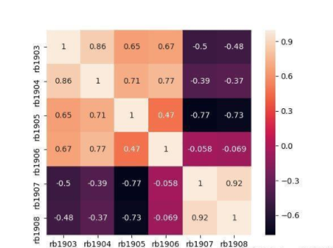 从价格的走势图中可观察到rb1903和rb1904以及rb1908和rb1907的价格走势之间显示出较强的相关性,并绘制出它们之间的相关矩阵